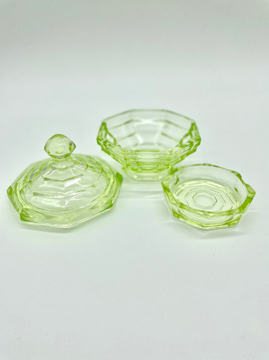 Lime green uranium glass Art Deco trinket pot and ring dish