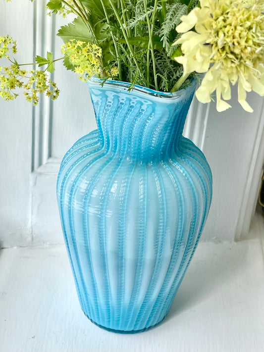 Sold outAntique blue glass ribbed cased vase